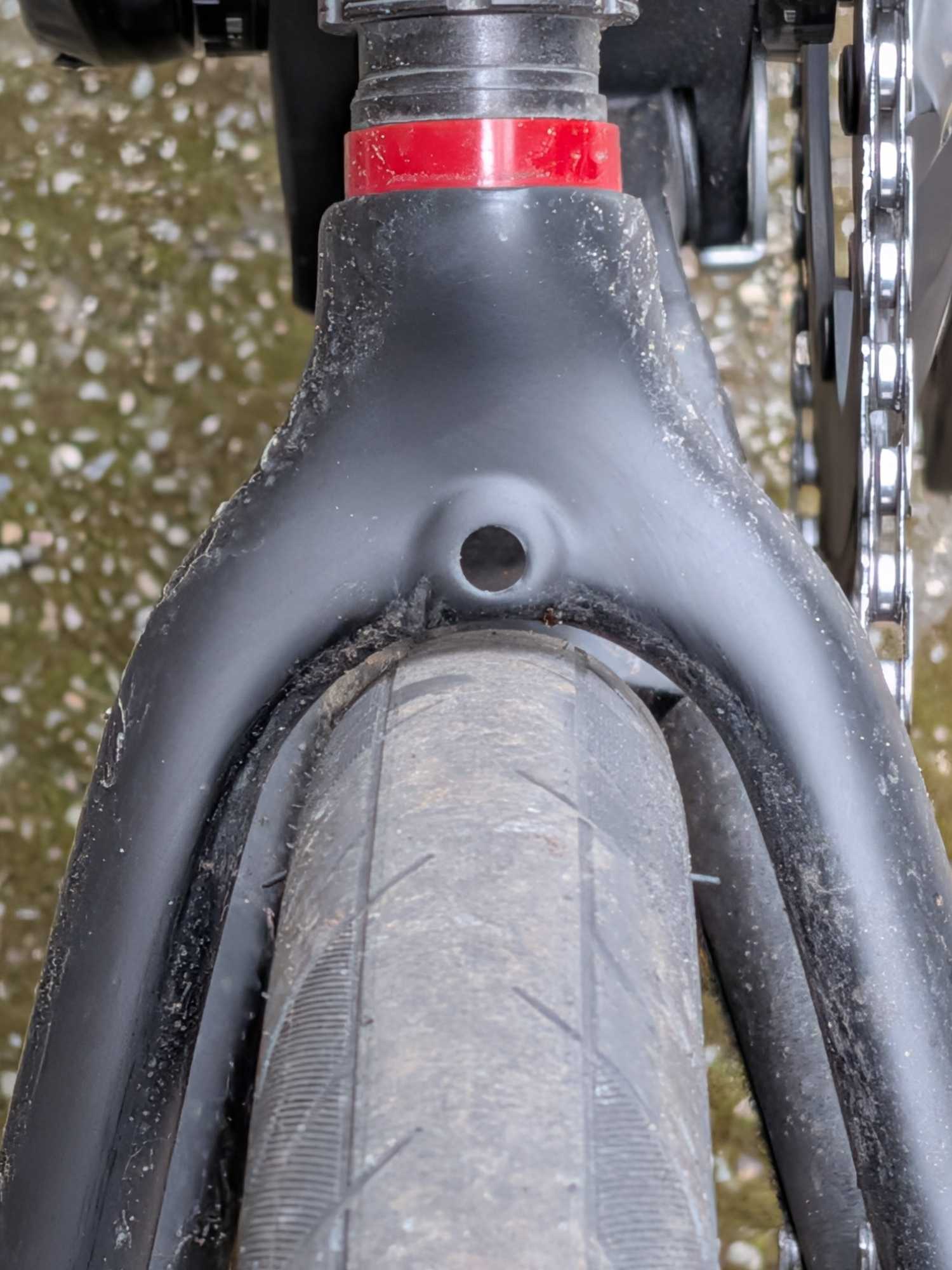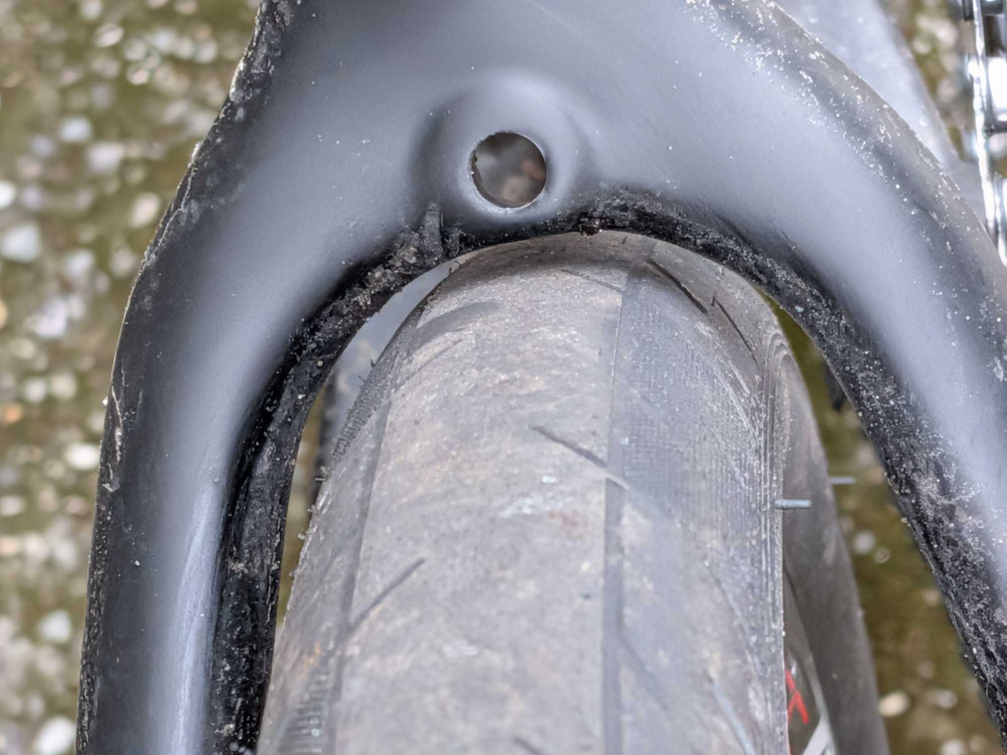 実際にクリアランスはこの通りぎりぎりで、ワイドタイヤに対応していないあたり、設計の古さを感じる。